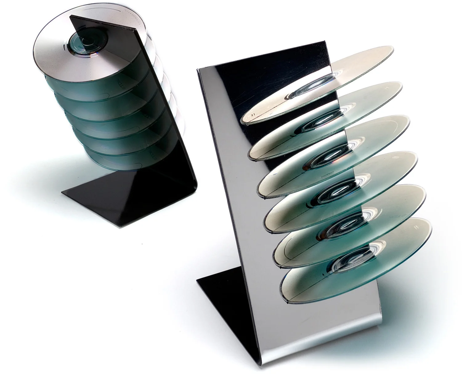 Mirror styrene was used to create an optical illusion with this cd stand that was meant to replace the common "spool" holders.